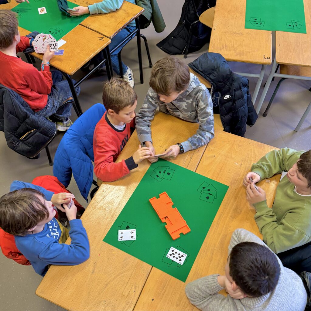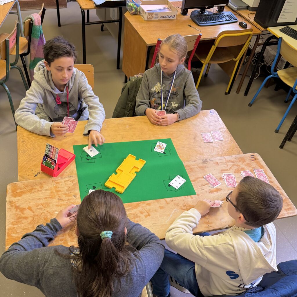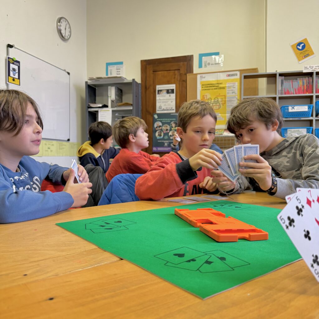 Le vendredi midi c’est le club bridge au collège ! Seize sixièmes pendant la pause méridienne jouent autour du tapis vert pour apprendre et s’amuser ! Bonne humeur et plaisir de découvrir ce jeu de cartes stratégiques sont en rendez-vous !